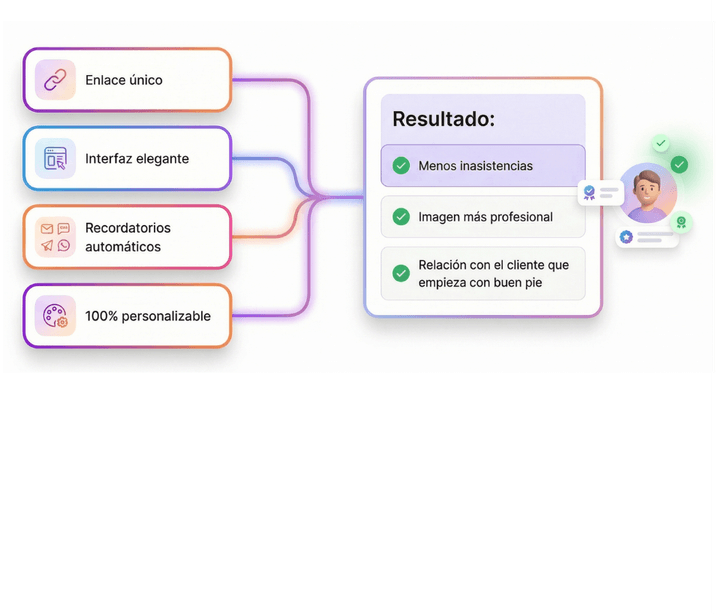 Tus clientes reciben un enlace único para reservar, recordatorios automáticos (Email, SMS, WhatsApp) y una interfaz elegante, 100% personalizable, que inspira confianza.