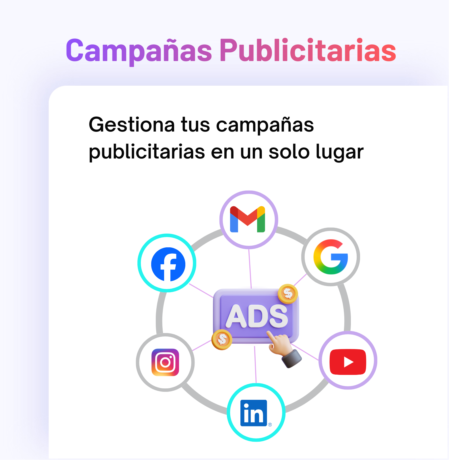 Gestiona toda tu publicidad desde un solo lugar. Con Ad Manager de MonkeyDESK puedes crear, lanzar y optimizar campañas de Facebook, Instagram, Google y LinkedIn Ads desde un dashboard único y fácil de usar. Olvídate de cambiar entre plataformas: analiza resultados, ajusta campañas y ejecuta anuncios de alto rendimiento sin salir de MonkeyDESK. Ahorra tiempo, reduce la complejidad y accede a publicidad profesional diseñada para negocios de cualquier tamaño.